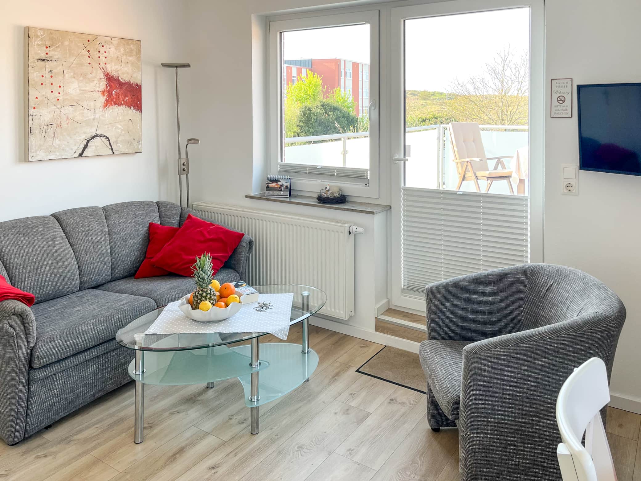 Unsere Ferienwohnung Dachterrasse besticht durch ihre helle, offene Raumgestaltung und den direkten Zugang zur eigenen Terrasse – perfekt, um die Nordseeluft schon morgens beim Frühstück zu genießen.